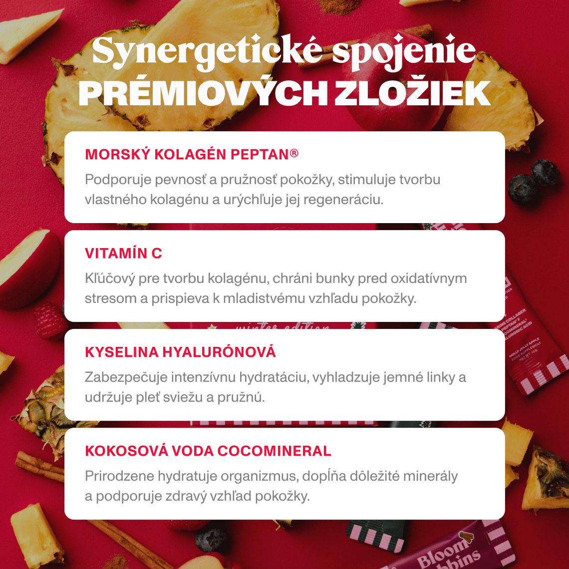 Peptidy morského kolagénu Peptan®, regulátor kyslosti (kyselina citrónová), inulín, kokosová voda v prášku CocoMineral®, aróma, hyaluronát sodný, vitamín C (kyselina L-askorbová), koncentrát z červenej repy, sladidlo (sukralóza)
